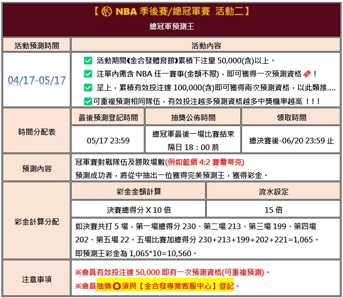 【🏀 NBA季後賽/總冠軍賽 活動二】活動時間為 04/17 至 05/17,活動期間內❰金合發體育館❱累積下注量50,000(含)以上,且注單內需含NBA任一賽事(金額不限),即可獲得一次預測資格🔖,(⭕️須與客服中心登記抽獎), 預測成功者可領取決賽總得分 X10 倍彩金🎊(圖二)。
